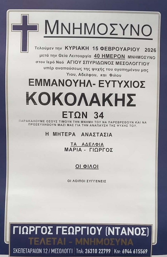 ΜΝΗΜΟΣΥΝΟ 15/2/2026 – ΕΜΜΑΝΟΥΗΛ-ΕΥΤΥΧΙΟΣ ΚΟΚΟΛΑΚΗΣ 40ΗΜΕΡΟ
