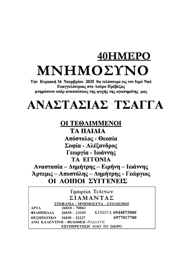 ΑρχικήΜΝΗΜΟΣΥΝΑΠρέβεζαςΜΝΗΜΟΣΥΝΟ 16/11/2025 - ΑΝΑΣΤΑΣΙΑ ΤΣΑΓΓΑ 40ΗΜΕΡΟ