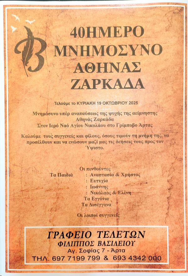 ΑρχικήΜΝΗΜΟΣΥΝΑΆρταςΜΝΗΜΟΣΥΝΟ 19/10/2025 - ΑΘΗΝΑ ΖΑΡΚΑΔΑ 40ΗΜΕΡΟ