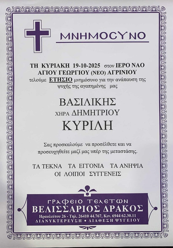 ΜΝΗΜΟΣΥΝΟ 19/10/2025 – ΒΑΣΙΛΙΚΗ Δ. ΚΥΡΙΛΗ ΕΤΗΣΙΟ