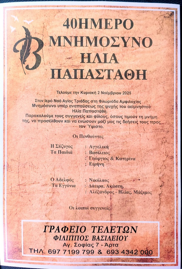 ΑρχικήΜΝΗΜΟΣΥΝΑΑιτωλοακαρνανίαςΜΝΗΜΟΣΥΝΟ 2/11/2025 - ΗΛΙΑΣ ΠΑΠΑΣΤΑΘΗΣ 40ΗΜΕΡΟ