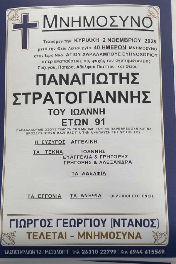 ΜΝΗΜΟΣΥΝΟ 2/11/2025 – ΠΑΝΑΓΙΩΤΗΣ Ι. ΣΤΡΑΤΟΓΙΑΝΝΗΣ 40ΗΜΕΡΟ