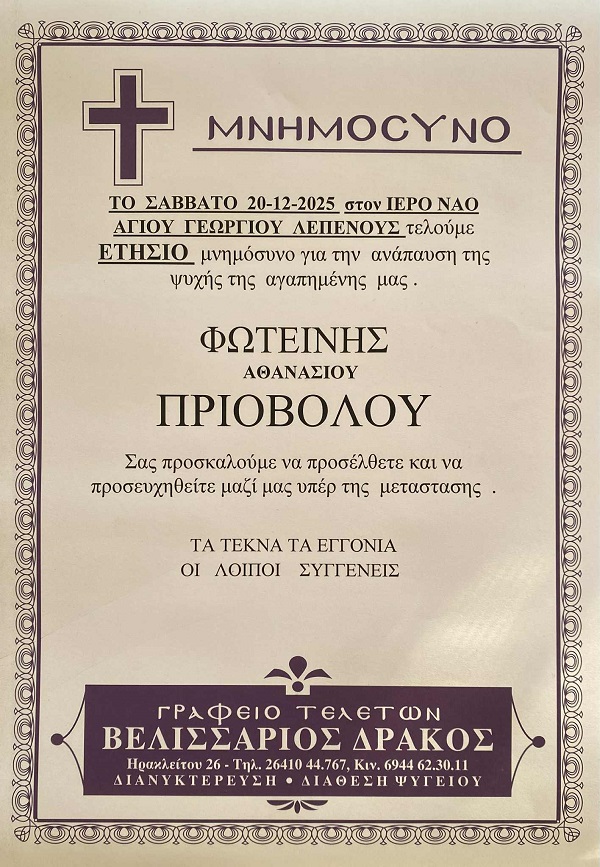 ΜΝΗΜΟΣΥΝΟ 20/12/2025 – ΦΩΤΕΙΝΗ Α. ΠΡΙΟΒΟΛΟΥ ΕΤΗΣΙΟ