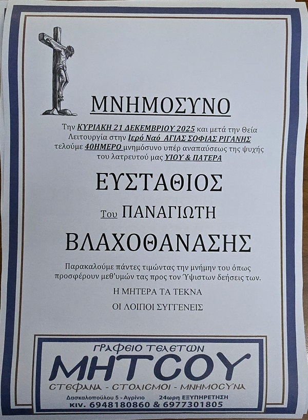 ΑρχικήΜΝΗΜΟΣΥΝΑΑιτωλοακαρνανίαςΜΝΗΜΟΣΥΝΟ 21/12/2025 - ΕΥΣΤΑΘΙΑ Π. ΒΛΑΧΟΘΑΝΑΣΗΣ 40ΗΜΕΡΟ