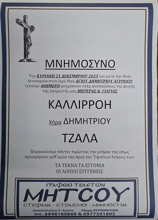 ΑρχικήΜΝΗΜΟΣΥΝΑΑιτωλοακαρνανίαςΜΝΗΜΟΣΥΝΟ 21/12/2025 - ΚΑΛΛΙΡΟΗ Δ. ΤΖΑΛΑ 40ΗΜΕΡΟ