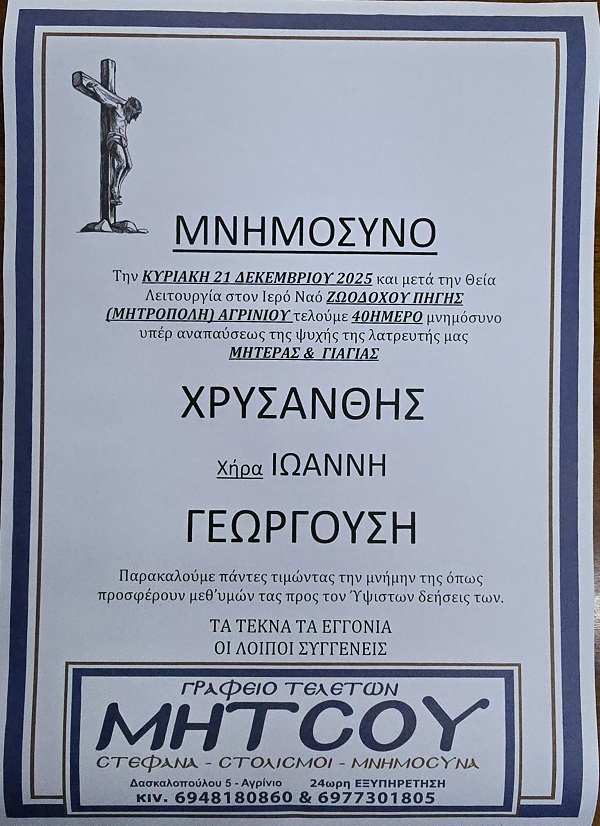 ΜΝΗΜΟΣΥΝΟ 21/12/2025 – ΧΡΥΣΑΝΘΗ Ι. ΓΕΩΡΓΟΥΣΗ 40ΗΜΕΡΟ