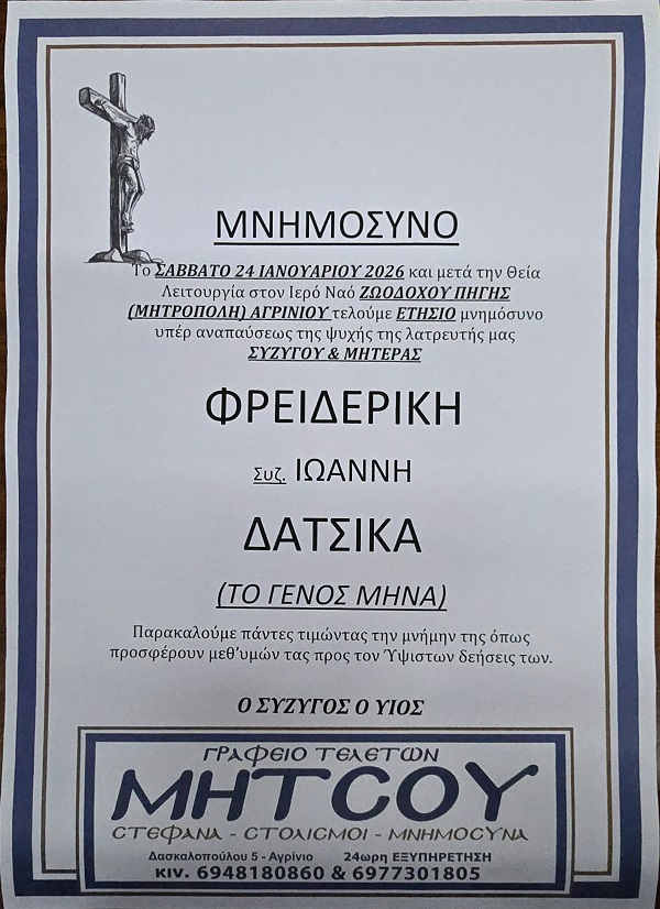 ΜΝΗΜΟΣΥΝΟ 24/1/2026 – ΦΡΕΙΔΕΡΙΚΗ Ι. ΔΑΤΣΙΚΑ-ΜΗΝΑ ΕΤΗΣΙΟ