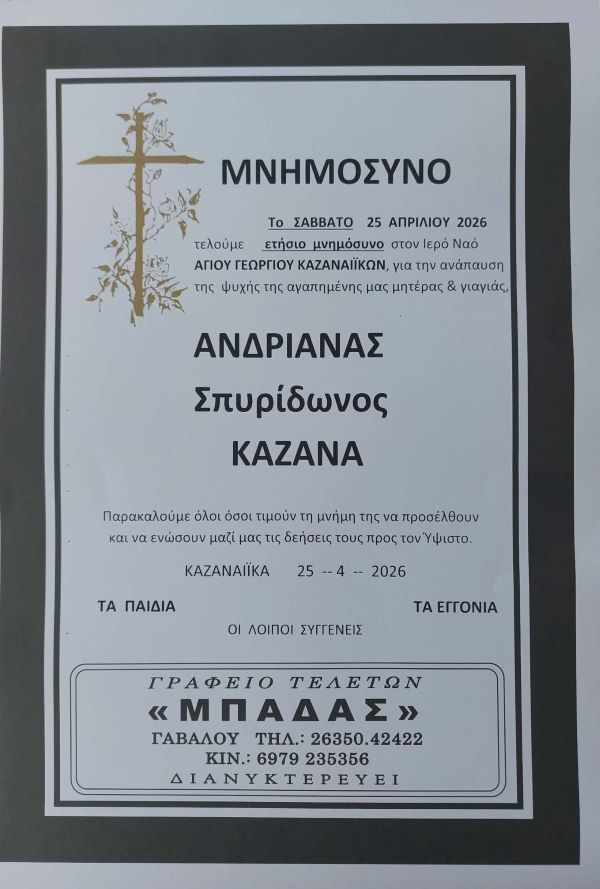 ΜΝΗΜΟΣΥΝΟ 25/4/2026 – ΑΝΔΡΙΑΝΑ Σ. ΚΑΖΑΝΑ ΕΤΗΣΙΟ