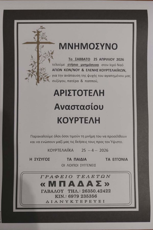 ΜΝΗΜΟΣΥΝΟ 25/4/2026 – ΑΡΙΣΤΟΤΕΛΗΣ Α. ΚΟΥΡΤΕΛΗΣ ΕΤΗΣΙΟ