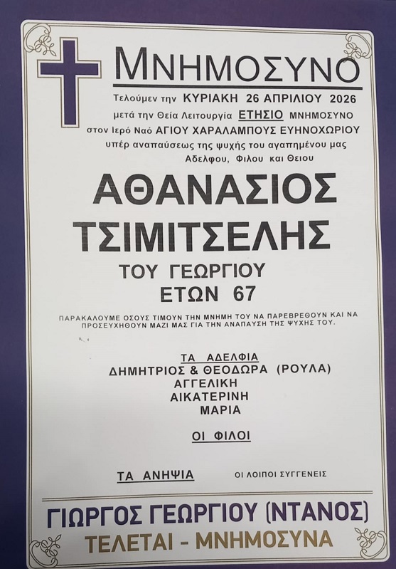 ΜΝΗΜΟΣΥΝΟ 26/4/2026 – ΑΘΑΝΑΣΙΟΣ Γ. ΤΣΙΜΙΤΣΕΛΗΣ ΕΤΗΣΙΟ
