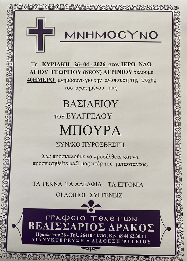 ΑρχικήΜΝΗΜΟΣΥΝΑΑιτωλοακαρνανίαςΜΝΗΜΟΣΥΝΟ 26/4/2026 - ΒΑΣΙΛΕΙΟΣ Ε. ΜΠΟΥΡΑΣ 40ΗΜΕΡΟ