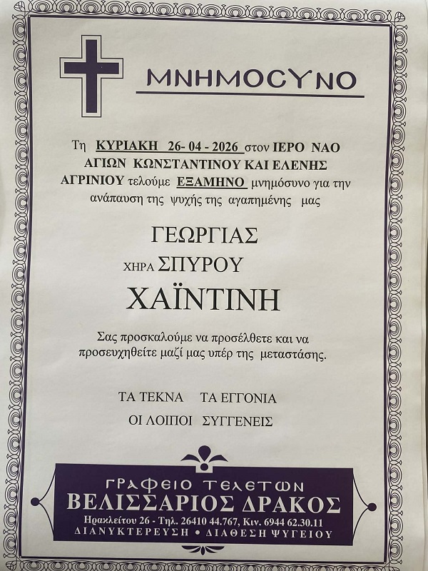 ΜΝΗΜΟΣΥΝΟ 26/4/2026 – ΓΕΩΡΓΙΑ Σ. ΧΑΪΝΤΙΝΗ ΕΞΑΜΗΝΟ