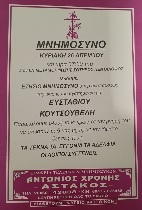ΜΝΗΜΟΣΥΝΟ 26/4/2026 – ΕΥΣΤΑΘΙΟΣ ΚΟΥΤΣΟΥΒΕΛΗΣ ΕΤΗΣΙΟ