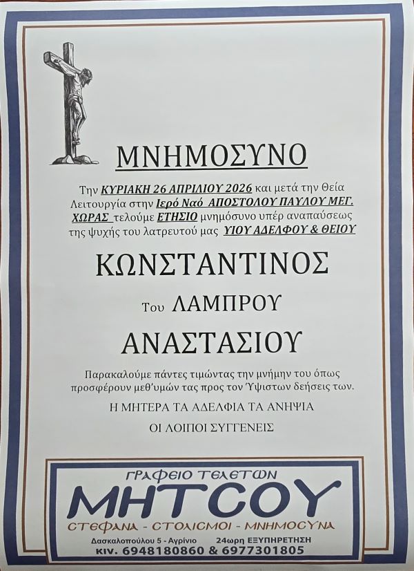 ΜΝΗΜΟΣΥΝΟ 26/4/2026 – ΚΩΝΣΤΑΝΤΙΝΟΣ Λ. ΑΝΑΣΤΑΣΙΟΥ