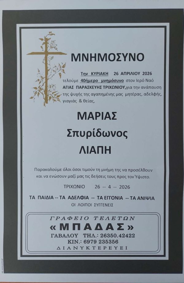 ΜΝΗΜΟΣΥΝΟ 26/4/2026 – ΜΑΡΙΑ Σ. ΛΙΑΠΗ 40ΗΜΕΡΟ