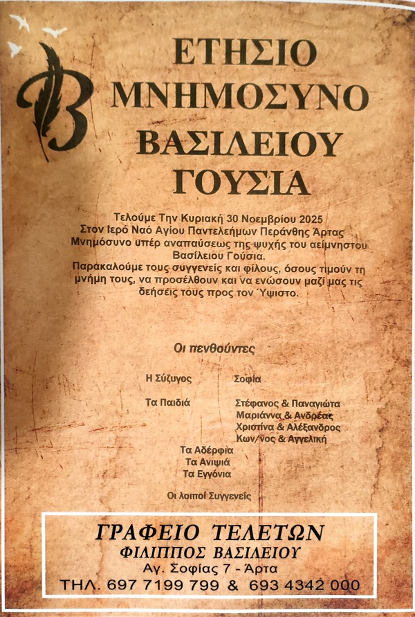 ΑρχικήΜΝΗΜΟΣΥΝΑΆρταςΜΝΗΜΟΣΥΝΟ 30/11/2025 - ΒΑΣΙΛΕΙΟΣ ΓΟΥΣΙΑΣ ΕΤΗΣΙΟ
