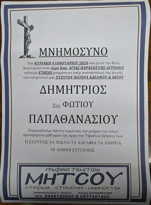 ΜΝΗΜΟΣΥΝΟ 4/1/2026 – ΔΗΜΗΤΡΙΟΣ Φ. ΠΑΠΑΘΑΝΑΣΙΟΥ ΕΤΗΣΙΟ