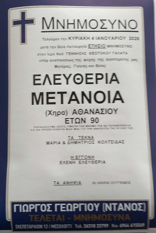 ΜΝΗΜΟΣΥΝΟ 4/1/2026 – ΕΛΕΥΘΕΡΙΑ Α. ΜΕΤΑΝΟΙΑ ΕΤΗΣΙΟ