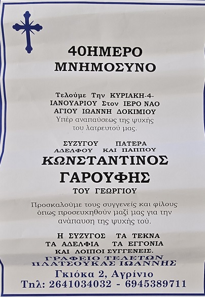 ΜΝΗΜΟΣΥΝΟ 4/1/2026 – ΚΩΝΣΤΑΝΤΙΝΟΣ Γ. ΓΑΡΟΥΦΗΣ 40ΗΜΕΡΟ