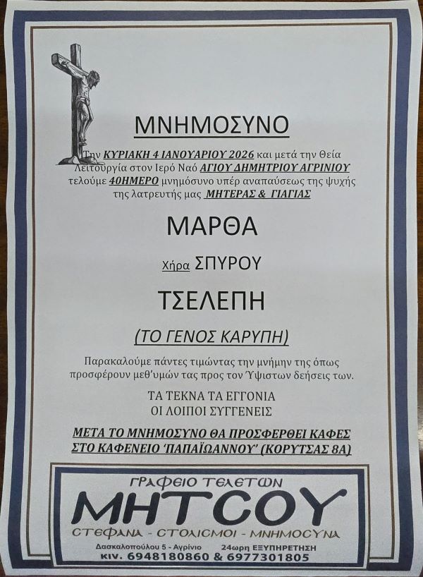 ΑρχικήΜΝΗΜΟΣΥΝΑΑιτωλοακαρνανίαςΜΝΗΜΟΣΥΝΟ 4/1/2026 - ΜΑΡΘΑ Σ. ΤΣΕΛΕΠΗ-ΚΑΡΥΠΗ 40ΗΜΕΡΟ