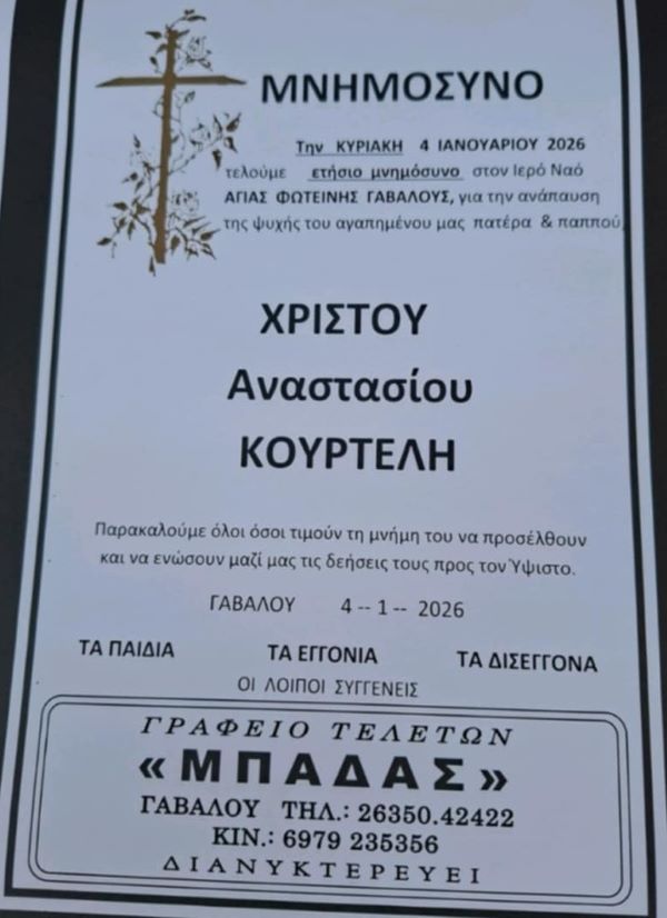 ΜΝΗΜΟΣΥΝΟ 4/1/2026 – ΧΡΙΣΤΟΣ Α. ΚΟΥΡΤΕΛΗΣ ΕΤΗΣΙΟ