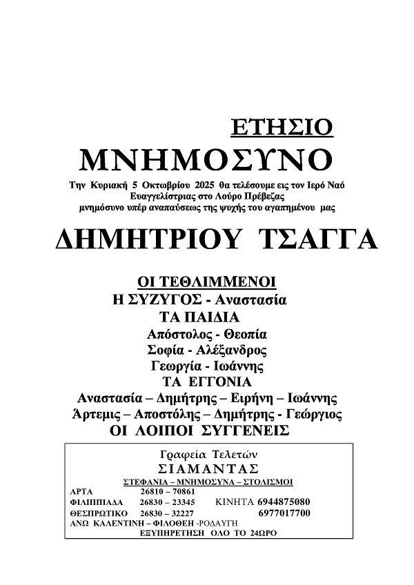 ΑρχικήΜΝΗΜΟΣΥΝΑΠρέβεζαςΜΝΗΜΟΣΥΝΟ 5/10/2025 - ΔΗΜΗΤΡΙΟΣ ΤΣΑΓΓΑΣ ΕΤΗΣΙΟ