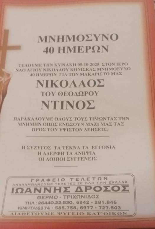 ΜΝΗΜΟΣΥΝΟ 5/10/2025 – ΝΙΚΟΛΑΟΣ Θ. ΝΤΙΝΟΣ 40ΗΜΕΡΟ