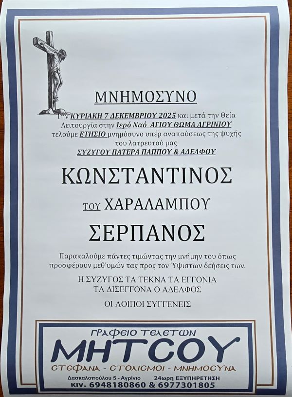 ΜΝΗΜΟΣΥΝΟ 7/12/2025 – ΚΩΝΣΤΑΝΤΙΝΟΣ Χ. ΣΕΡΠΑΝΟΣ ΕΤΗΣΙΟ