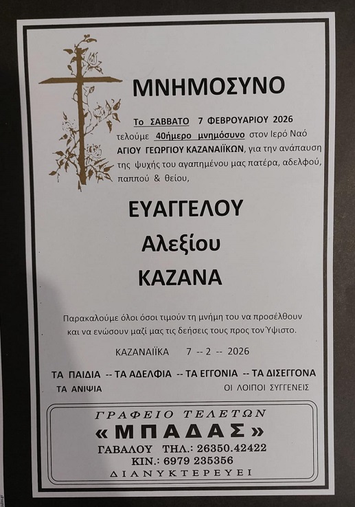 ΜΝΗΜΟΣΥΝΟ 7/2/2026 – ΕΥΑΓΓΕΛΟΣ Α. ΚΑΖΑΝΑΣ 40ΗΜΕΡΟ