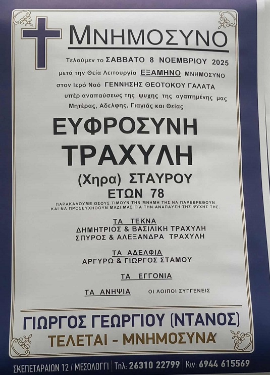 ΑρχικήΓΕΝΙΚΑΜΝΗΜΟΣΥΝΟ 8/11/2025 - ΕΥΦΡΟΣΥΝΗ Σ. ΤΡΑΧΥΛΗ ΕΤΩΝ 78
