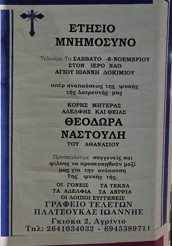 ΜΝΗΜΟΣΥΝΟ 8/11/2025 – ΘΕΟΔΩΡΑ Α. ΝΑΣΤΟΥΛΗ ΕΤΗΣΙΟ