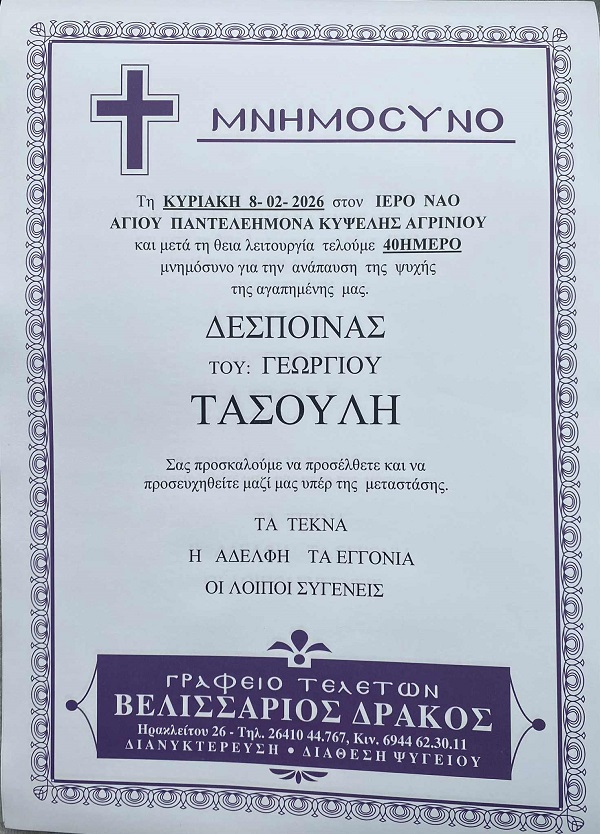 ΑρχικήΜΝΗΜΟΣΥΝΑΑιτωλοακαρνανίαςΜΝΗΜΟΣΥΝΟ 8/2/2026 - ΔΕΣΠΟΙΝΑ Γ. ΤΑΣΟΥΛΗ 40ΗΜΕΡΟ