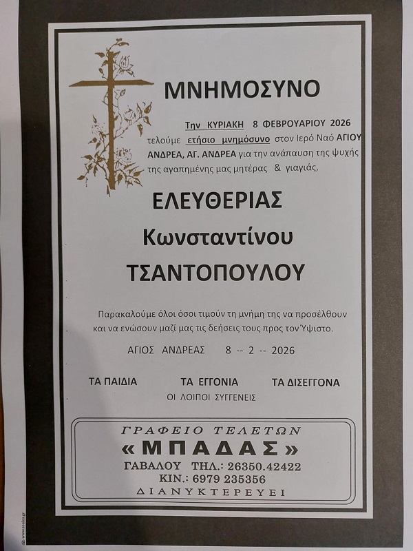 ΜΝΗΜΟΣΥΝΟ 8/2/2026 – ΕΛΕΥΘΕΡΙΑ Κ. ΤΣΑΝΤΟΠΟΥΛΟΥ ΕΤΗΣΙΟ