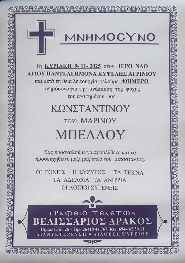 ΜΝΗΜΟΣΥΝΟ 9/11/2025 – ΚΩΝΣΤΑΝΤΙΝΟΣ Μ. ΜΠΕΛΛΟΣ 40ΗΜΕΡΟ